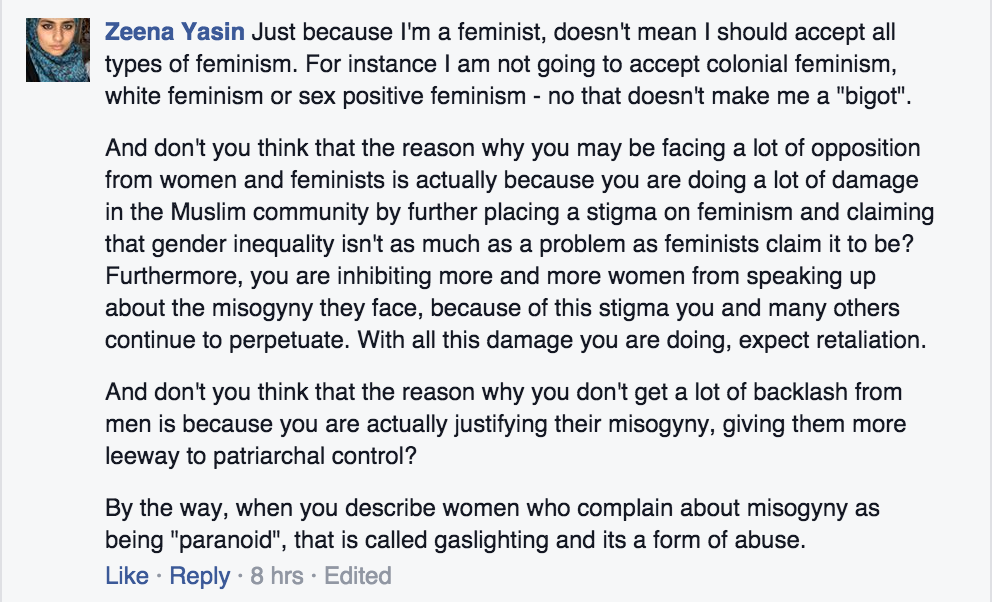 You feel that I am doing “damage” to your campaign for feminism in the Muslim community. If that is the case, it is more due to the brittleness of feminist ideas, rather than my simple questioning of it.