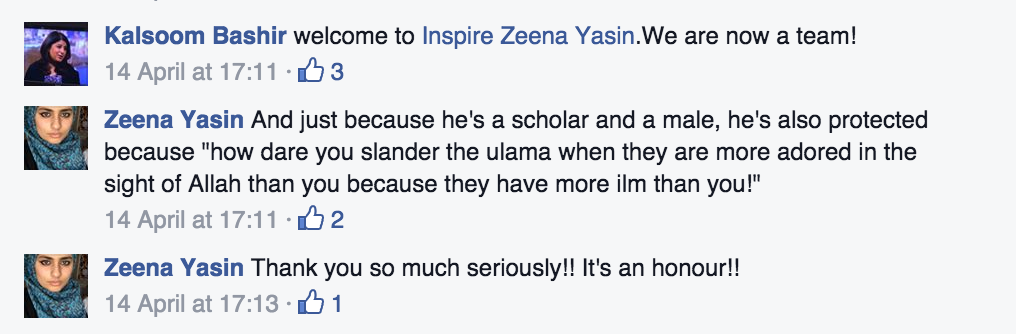 Following the publication of my article, “Sara Khan and Maajid Nawaz: Faux Indignation and Feminist Excommunication (Takfir)“, I received a comment from one of Sara Khan’s supporters, Zeena Yasin. Zeena Yasin was very recently welcomed to Sara Khan’s Inspire team, by its other Co-Founder, Kalsoom Bashir: