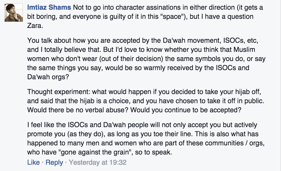 It is fairly self evident that I would be invited by organisations who agree with what I have to say. To expect otherwise, is the same as expecting an animal rights forum to accept its speakers wearing animal fur, or expecting the lib-dems to accept its politicians preaching UKIP values. The argument made by Sara Khan et al, is that ISOCs are intolerant of those who advocate women’s rights, yet I am a female speaker who advocates women’s (and men’s) rights according to Islam, without opposition from the Muslim community. I doubt the Council for Ex-Muslims would invite an ex-atheist who became a staunch Muslim to speak about truth.